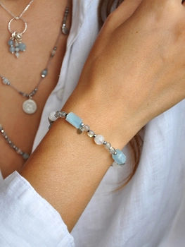 Bransoletka na gumce, z akwamarynu, kamienia księżycowego i labradorytu - srebro