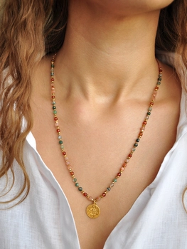 Naszyjnik regulowany z granatu zielonego, jaspisu i kwarcu dymnego - złoty