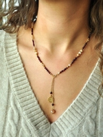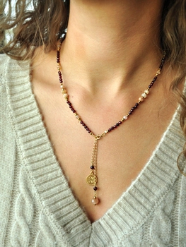 Naszyjnik z zapięciem z przodu z granatu i kamienia słonecznego - złoto
