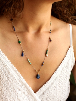 Naszyjnik długi z amazonitu i larimaru - złoty