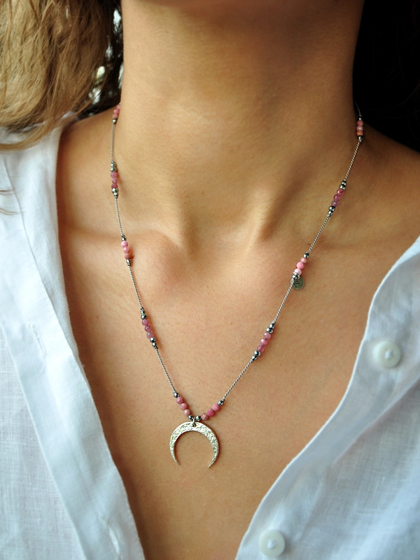 Subtelny, ręcznie robiony naszyjnik z rodonitu, różowego turmalinu i srebrnego hematytu. Naturalne kamienie nawleczone na nić jedwabną zwieńczoną stoperem. Ozdobny księżyc, zawieszka sygnowana logotypem L'atelier de Susan oraz zapięcie wykonane ze srebra próby 925. Długość naszyjnika regulowana w zakresie ok. 32 - 61 cm. Szeroki zakres regulacji umożliwia noszenie naszyjnika zarówno do głębokiego dekoltu, jak i w roli chokera.