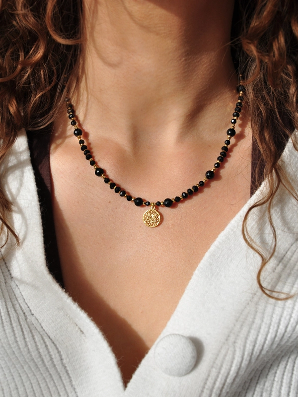 Ekskluzywny, ręcznie robiony naszyjnik z kamieni naturalnych. Różnorodne kształty i rozmiary czarnego turmalinu zostały wzbogacone pozłacanym hematytem, by stworzyć oryginalny charakter biżuterii. Ozdobna ażurowa zawieszka z autorską mandalą sygnowaną logotypem L’atelier de Susan oraz wygodne, klasyczne zapięcie ze srebra próby 925 pokrytego 24 karatowym złotem. Długość naszyjnika - ok. 43cm + 5 cm przedłużki. Naturalne pochodzenie kamieni nadaje wyjątkowość każdemu naszyjnikowi. Sprawia również, że kształt i struktura kamieni może się nieznacznie różnić od egzemplarza przedstawionego na zdjęciu.