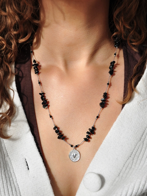 Ręcznie robiony, naszyjnik z czarnego turmalinu i posrebrzanego hematytu. Naturalne kamienie nawleczone na nić zwieńczoną stoperem. Ozdobna zawieszka z sercem, zawieszka sygnowana logotypem L'atelier de Susan oraz zapięcie wykonane ze srebra próby 925. Długość naszyjnika regulowana w zakresie ok 40 - 74 cm. Szeroki zakres regulacji umożliwia noszenie naszyjnika zarówno do głębokiego dekoltu, jak i w roli chokera.