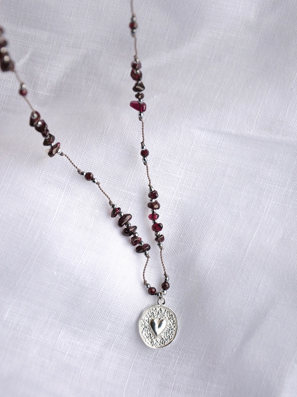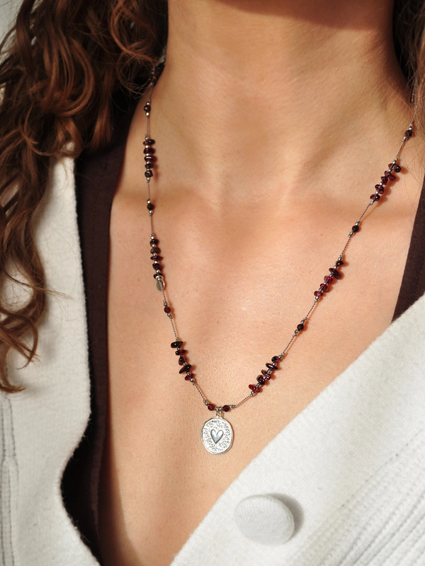 Ręcznie robiony, naszyjnik z granatu i posrebrzanego hematytu. Naturalne kamienie nawleczone na nić zwieńczoną stoperem. Ozdobna zawieszka z sercem, zawieszka sygnowana logotypem L'atelier de Susan oraz zapięcie wykonane ze srebra próby 925. Długość naszyjnika regulowana w zakresie ok 40 - 74 cm. Szeroki zakres regulacji umożliwia noszenie naszyjnika zarówno do głębokiego dekoltu, jak i w roli chokera.