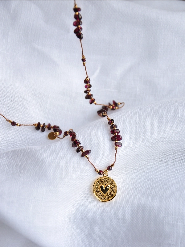 Ręcznie robiony, naszyjnik z granatu i pozłacanego hematytu. Naturalne kamienie nawleczone na nić zwieńczoną stoperem. Ozdobna zawieszka z sercem, zawieszka sygnowana logotypem L'atelier de Susan oraz zapięcie wykonane ze srebra próby 925 podwójnie krytego 24-karatowym złotem. Długość naszyjnika regulowana w zakresie ok 40 - 74 cm. Szeroki zakres regulacji umożliwia noszenie naszyjnika zarówno do głębokiego dekoltu, jak i w roli chokera.