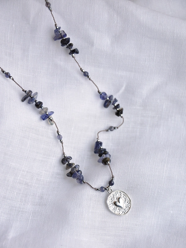 Ręcznie robiony, naszyjnik z iolitu i posrebrzanego hematytu. Naturalne kamienie nawleczone na nić zwieńczoną stoperem. Ozdobna zawieszka z sercem, zawieszka sygnowana logotypem L'atelier de Susan oraz zapięcie wykonane ze srebra próby 925. Długość naszyjnika regulowana w zakresie ok 40 - 74 cm. Szeroki zakres regulacji umożliwia noszenie naszyjnika zarówno do głębokiego dekoltu, jak i w roli chokera.