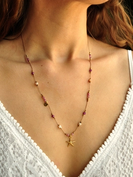 Naszyjnik regulowany z różowego turmalinu, rubinu i opalu peruwiańskiego - złoty